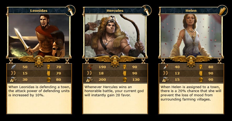 Κάποοι ήρωες εκπληρώνουν πλήρως τις δυνατότητές τους αν τους αναθέσουμε σε κάποια από τις πόλεις μας. Κάθε πόλη θα έχει 2 θέσεις που μπορούν να περιέχουν οποιονδήποτε ήρωα.