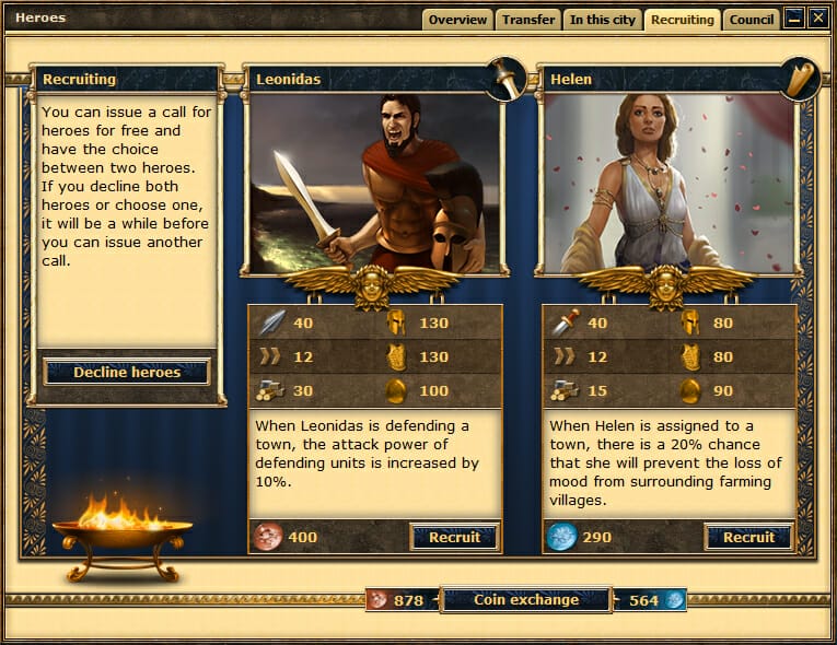 Αν δεν μας αρέσουν οι Ήρωες που μας προσφέρονται, μπορούμε να τους αγνοήσουμε και να κάνουμε ένα νέο κάλεσμα, αλλά αυτό θα πάρει λίγο χρόνο (6 ώρες). Αν αγοράσουμε τον έναν από τους ήρωες που μας δόθηκαν, ο άλλος θα εξαφανιστεί και θα μπορούμε να κάνουμε ένα νέο κάλεσμα και πάλι σε 6 ώρες. Πάντα θα έχουμε την επιλογή να ανταλλάξουμε Νομίσματα Σοφίας με Νομίσματα Πολέμου και το αντίστροφο, με αναλογία 2 προς 1. Αυτό θα είναι χρήσιμο όταν μας λείπουν μόνο λίγα νομίσματα ή άν έχουμε ήδη αγοράσει όλους τους διαθέσιμους ήρωες μιας κατηγορίας.
