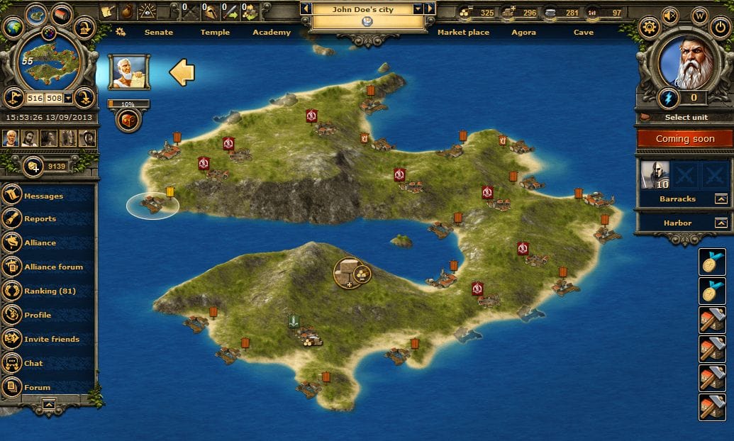 • Δεδομένου ότι το παιχνίδι έχει  3 επίπεδα, μόλις βάλετε την επισκόπηση της πόλης σε πλήρη οθόνη θα έχετε τη δυνατότητα να ελίσσεστε εύκολα μεταξύ αυτών των επιπέδων με τα πάνω αριστερά κουμπιά (πόλη, νησί, στρατηγικός χάρτης).