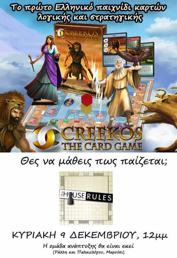 Σε προηγούμενο post μας, παρουσιάσαμε το Creekos, ένα Ελληνικό παιχνίδι καρτών, λογικής και στρατηγικής.  Αν θες να μάθεις πώς παίζεται το παιχνίδι από τους ειδικούς, δεν έχεις παρά να βρεθείς στο This House Rules στο Μαρούσι την Κυριακή 9 Δεκεμβρίου, όπου θα έχεις την ευκαιρία να λύσετε οποιαδήποτε απορία σας με τους δημιουργούς του παιχνιδιού!